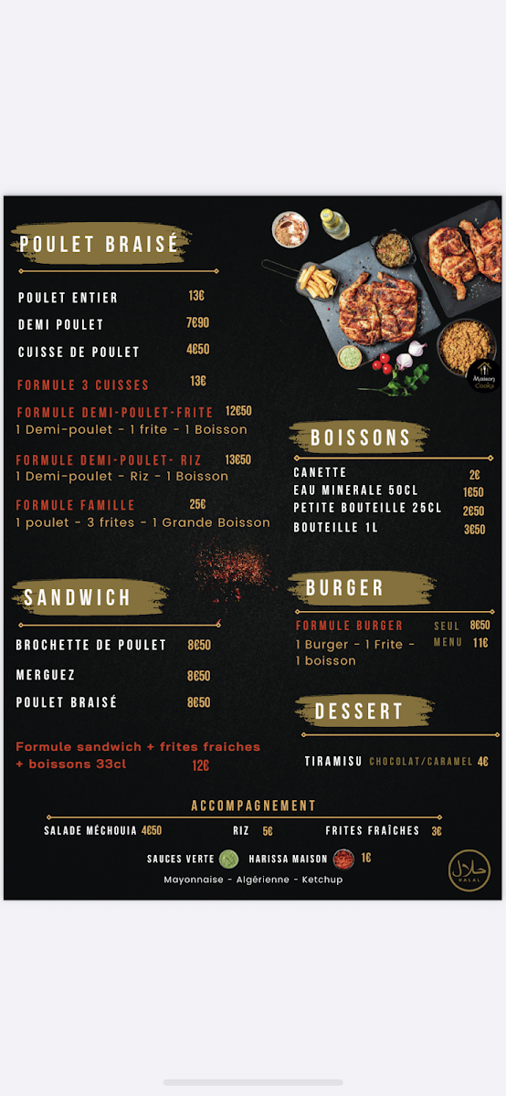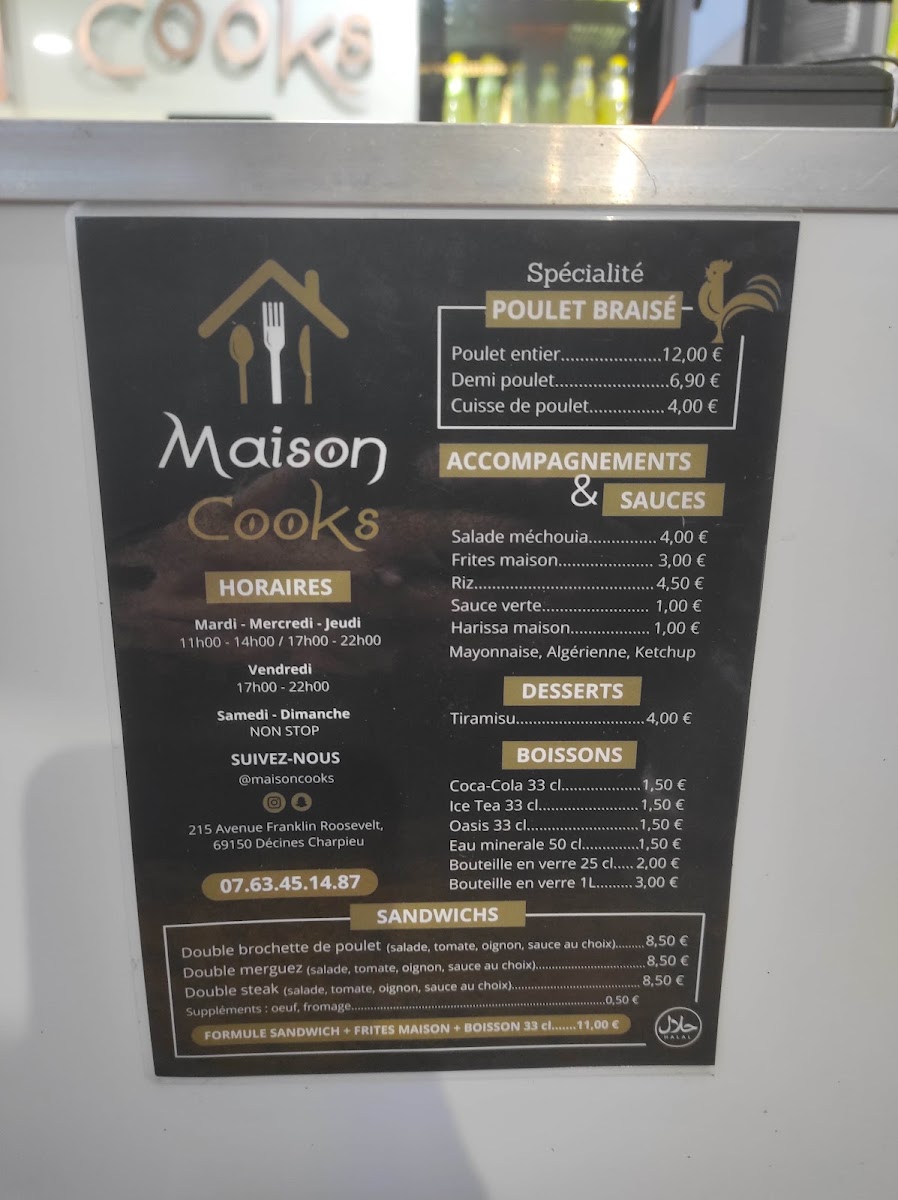 Introducing "Maison Cooks poulet braisé," a culinary gem nestled in Décines-Charpieu, France, located at 215 Av. Franklin Roosevelt. This brand focuses on the art of braised chicken, a dish renowned for its tenderness and rich flavors. Each plate is thoughtfully prepared to highlight the succulent taste of the chicken, accompanied by a variety of vibrant sides that reflect the essence of French cuisine.